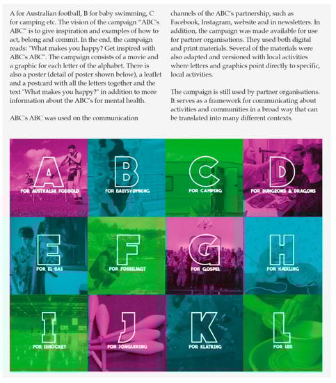 - Koushede, V.; Nielsen, L.; Meilstrup, C.; Donovan, R.J. From rhetoric to action: Adapting the Act-Belong-Commit Mental Health Promotion Programme to a Danish context. Int. J. Ment. Health Promot. 2015, 17, 22–33. [Google Scholar] [CrossRef]
