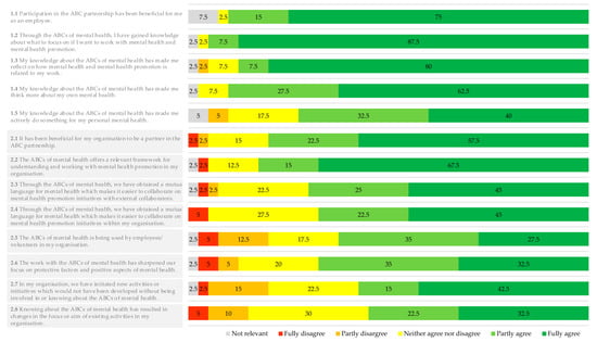 | 2.4 | Mutual language for internal collaboration | Through the ABCs of mental health, we have obtained a mutual language for mental health which makes it easier to collaborate on mental health promotion initiatives within my organisation. | |