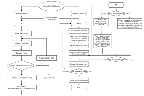 Evolutionary algorithms have strong robustness to solve complex optimization problems []. The immune algorithm (IA) is a new intelligent algorithm inspired by biological immune systems. It applies the diversity of the immune system to generate and maintain the diversity of the population, which overcomes the “premature” problems that are difficult to deal with in the general optimization process, especially in the multimodal function, and finally obtains the global optimal solution []. The ant colony optimization (ACO) algorithm, as one of the modern heuristic algorithms, has received wide attention since it was proposed. It has the advantages of positive feedback, parallelism, and robustness, which show good performance in solving task allocation and path optimization. However, at the same time, the ant colony algorithm also has some defects, such as when solving large-scale problems, as problems such as long operation time, slow convergence speed, and ease of getting into the local optimal solution frequently happened. The tabu search (TS) algorithm constructs a tabu table to avoid getting into the global optimal solution and improves the optimization ability of the algorithm.