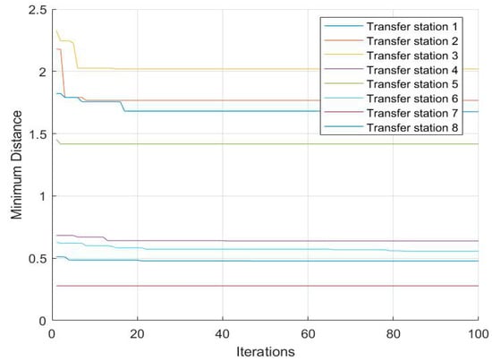 As it can be seen, there are eight relay stations in total in the diagram, which are color-coded. Each transport station has its corresponding hospital. The green line is the result of path optimization by utilizing the ant colony–tabu hybrid algorithm. This result ensures the efficiency of medical waste dispatch in the area controlled by each transport station effectively.