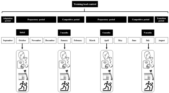 Figure 1 details the timeline of periodization and testing during the season. Athletes had a four-week adaptation before the initial measurement (October), where they performed 85.71 ± 13.62 km per week and a four-week transition period after the second competitive period. The first preparatory period began in October through December and the second one during March through May. Competitive periods were coincident with January and February when the athletes performed cross country competitions (10,000–12,000 m approximately), and the second competitive period was in June-July when they performed track and field competitions between 1500 and 5000 m. A GPS pack equipped with pulsometers (Polar Vantage M. Norway) was used to track the training loads during the season.