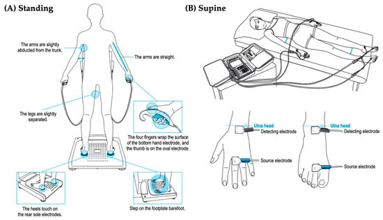 The testing postures and the electrode placements (A) BIA in the standing position (B) BIA in the supine position [permitted from the manufacture].