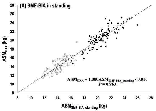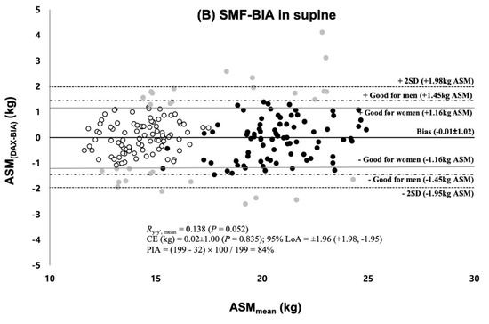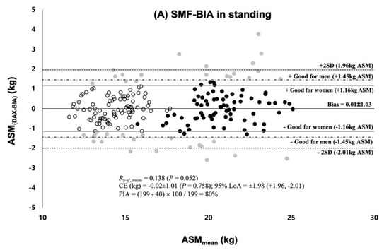 Table 4 compared the performance of ASM predicted by various BIA equations (including newly developed, built-in and published [13,14,15,16,17,18,19]) based on this study data with ASM measured by DXA. In the equation array of the standing and supine mode, there was a high determinant coefficient between each ASMBIA and ASMDXA (R2 = 0.891~0.923, p < 0.001) equations. However, the total error (TE) of all published and built-in equations exceeded the acceptable subjective range except for the built-in BIAInBody770 equation and BIAKyle equation. The BIAKyle equation shows a high R2 and its TE was within the acceptable subjective range of the standard error. In addition, it has no significant difference in the bias and PIA value was 74.4%. The built-in BIAInBody770 equation shows acceptable accuracy with a high R2, precise TE with subject ratings as “Good” for men and “Very good” for women, no difference in the bias, and 77.9% of PIA, whereas the built-in BIAInbodyS10 equation showed poor subject ratings with poor TE, significant difference in the bias and 37.4% of PIA. The two new BIA equations performed best in estimating the ASM with much higher R2 and TE with the acceptable subject ratings.