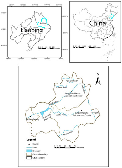 Fushun (123°39′–125°28′ E, 41°14′–42°28′ N), which is located east of Liaoning Province (Figure 1), covers an area of 11,271.03 square kilometers. Fushun is an important water source protection area of Liaoning Province, an important industrial base, and a subcentral city of the Shenyang Economic Zone. The total population of the city was 2.158 million in 2015, and the GDP was recorded at RMB 121.65 billion. The average precipitation of the city was 690.3 mm, and the water resources totaled 1.951 billion m3. Fushun is rich in water resources, but the ecological functions of rivers and other water bodies declined due to an increase in industrial and agricultural water and sewage discharge.