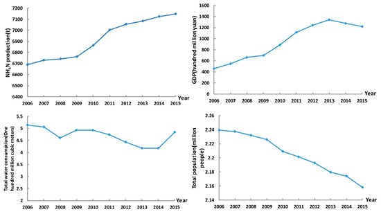 Hydrological data, such as total water consumption, is derived from the Fushun Water Resources Bulletin [10]. Pollutant related data, such as NH4N emissions, are gathered from the Fushun Statistical Yearbook [11]. Other socioeconomic data, such as total population and GDP, are obtained from the Fushun Yearbook [12]. Figure 2 shows the change trend of total water consumption, NH4N production, total population and GDP from 2006 to 2015.