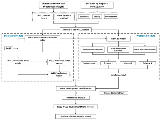 The main framework of this study is shown in Figure 3, mainly using four methods and divided into two modules. Combining these two modules can obtain the future development trend of the Fushun WECC index. The Monte Carlo method is introduced to analyze the uncertainty of some water environment evaluation indicators, in this manner, the predicted values of the four schemes become more realistic and accurate. Finally, the fuzzy WECC development trend is obtained. On this basis, policy recommendations are proposed.