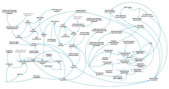 The SD model starts from the internal structure of the system, and the first-order differential equations are used to reflect the causal feedback relationship among the variables in the system; hence, the SD simulation model is established. The policy simulation of different development schemes is first performed in the evaluation of carrying capacity, and then the decision variables are predicted. The decision variables are taken as the index system of the carrying capacity evaluation, and then the index evaluation method is combined for calculation and analysis. Lastly, the optimal development scheme and the corresponding carrying capacity are obtained. The SD model method simulates the behavior of a real-world nonlinear complex system over time and has advantages in dynamic monitoring, which can consider the interaction between various factors within the system [22]. This method is suitable for dealing with long-term and periodic problems and is an effective tool for analyzing complex systems [23].