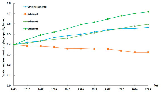 As shown in Figure 5, except for the slow decline of WECC in Scheme 1, the future development of WECC in the other three schemes is on the rise. In 2015, the WECC index was 0.398. In the original scheme, the WECC rises slowly and can only achieve a “general” carrying state with a WECC index of 0.566 in 2025. The WECC trend in Scheme 2 is very similar to the original one. Although the WECC index can reach 0.597 in 2025, which is slightly higher than the original scheme, the WECC index in 2016–2022 is lower than the original scheme, so the environmental protection scheme may take a long time to take effect. The effect is not obvious in the short term, and even the growth of the WECC index is even slower because it inhibits the economy. In the context of neglecting the environment and developing the economy at a high speed, the WECC in Scheme 1 has declined slowly, reaching only 0.324 in 2025.Compared with the other three schemes, the advantages of Scheme 3 are prominent and the upward trend is obvious. The WECC in this scheme will be in a “good” carrying state with a WECC index of 0.717 in 2025, indicating that coordinated development is the key to solve the WECC problem.