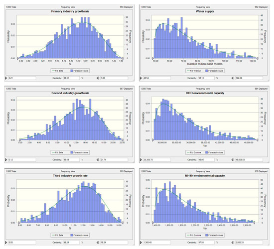 This study analyzed the uncertainty of the WECC results obtained in the economic and water environment by analyzing the real data of Fushun City in the past 20 years. Regression analysis was used to identify the relationship between the growth rate of the three industries and the growth rate of GDP. The probability distribution of the growth rate of the three industries was obtained in accordance with the Monte Carlo method (as shown in Figure 6). In terms of the water environment, regression analysis was used to identify the relationship between water availability, COD environmental capacity, and NH4N environmental capacity and precipitation. Then, the probability distribution of available water, COD environmental capacity, and NH4N environmental capacity were obtained in accordance with the Monte Carlo method (as shown in Figure 6).