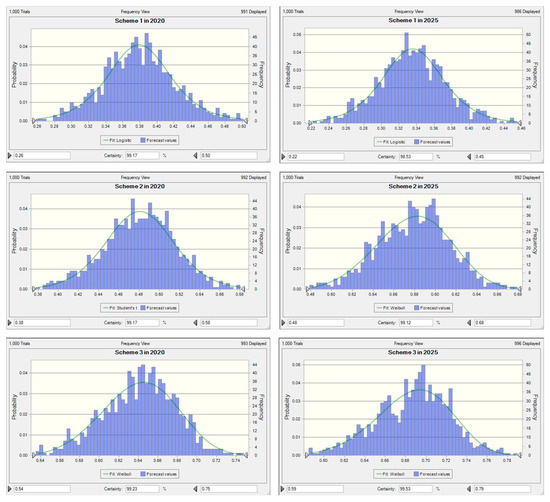 The benchmark year (2015) in Fushun is in a poor carrying state. As shown in Figure 5, if the current situation continues to develop, the water environment in Fushun will not improve much by 2025. Therefore, this study proposes three schemes to improve the current poor water environment. In order to make the predictions of Schemes 1, 2, and 3 more convincing, we performed uncertainty analysis on the general results of WECC that we have obtained. From the perspective of uncertain results, this study has achieved its purpose. We have obtained the variation intervals of the WECC index values and the probability of each value in interval in each of the three schemes from 2016 to 2025. Compared with the WECC index value predicted when Zhang et al. (2014) studied and evaluated the development trend of water ecological carrying capacity in the Siping area by combining system dynamics and the analytic hierarchy process [28], the uncertain results obtained in this study will have more reference significance. Figure 7 shows only the WECC index values for the years 2020 and 2025. It is not difficult to see from the figure that the WECC index value of the maximum probability that can be achieved in Scheme 3 in 2025 is higher than that of the other two schemes, and the overall interval value is relatively high.