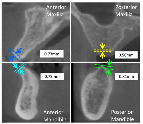 Studies have employed CT or CBCT to measure the thickness of the crestal cortical bone at the dental implant site. Miyamoto et al. [] used CT to undertake such measurements at 225 prospective dental implant sites, reporting a mean thickness of the crestal cortical bone of 1.49 ± 0.34 m and 2.22 ± 0.47 m at the maxilla and mandible, respectively. Using CBCT, Gerlach et al. [] reported a mean thickness of crestal cortical bone of 2.00 ± 0.15 m at the mandible. Using CT for 75 prospective dental implant sites, Sugiura et al. [] reported a mean thickness of the crestal cortical bone of 1.5 ± 0.7 m at the posterior mandible. As evident in these measurements, studies have reported different thickness of the crestal cortical bone. Because this study employed CBCT with a voxel resolution of only 150 μm, which is far smaller than the voxel resolutions of previous studies employing CT or CBCT, the thickness of the crestal cortical bone of prospective dental implant sites measured in this experiment was thinner than those in previous studies. Because of the partial volume effect, higher scanning resolutions can result in an overestimation of the thickness value. We conjecture that this is why values measured in previous studies are thicker than those in our study.