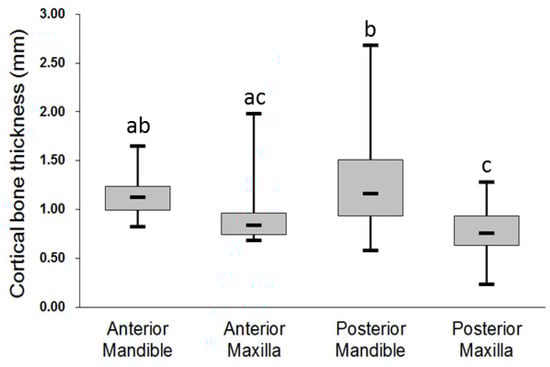 Thickness of the crestal cortical bone at the four jawbone regions for the older group. Post hoc pairwise comparisons were conducted using Tukey’s test; use of the same letter (a, b, c) indicates no significant difference at the 0.05 level.
