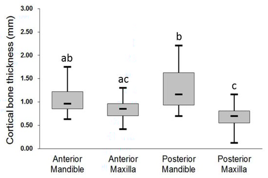 Thickness of the crestal cortical bone at the four jawbone regions for the younger group. Post hoc pairwise comparisons were conducted using Tukey’s test; use of the same letter (a, b, c) indicates no significant difference at the 0.05 level.