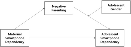 Above all, negative parenting style affects children’s smartphone dependency. Family environment factors also act as important predictors of children’s smartphone dependency [,]. In particular, a negative parenting style including rejection or coercion directly increased children’s smartphone dependency [,,]. Moreover, a negative parenting attitude indirectly affected children’s smartphone dependency through depression, aggression [], low quality of communication [], neuroticism, and psychological maltreatment []. Therefore, it is necessary to examine the mediating effects of negative parenting on the relationship between maternal smartphone dependency and children’s smartphone dependency.