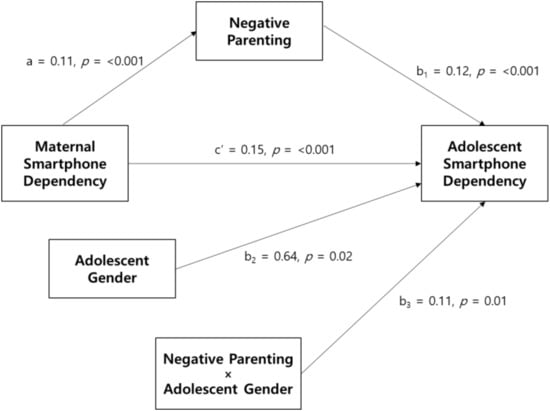 Data analysis was conducted using SPSS version 22.0 (IBM Corp., Armonk, NY, USA). First, to handle missing data, full information maximum likelihood (FIML) was used. Skewness and kurtosis for each variable were checked to determine whether the data had a normal distribution. Then, descriptive statistics and bivariate correlations analyses were conducted. Next, to test the study hypotheses, the moderated mediation model was employed using Hayes PROCESS macro (Model 14) []. This moderated mediation model yields multiple coefficients of direct and indirect effects. Adolescent smartphone dependency was entered into the moderated mediation model as the outcome variable, mother smartphone dependency as the predictor variable, negative parenting as the mediator, and adolescent gender as a moderator of the relationship between negative parenting and adolescent smartphone dependency. The 95% bias corrected confidence interval from 5000 resamples was generated using the bias-corrected bootstrapping method. The number of bootstrapping size was 5000. The predictor and moderator variables were mean centered. Significant indirect effects were identified when the confidence interval (CI) did not include zero.