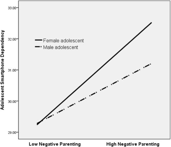 There are gender differences in the patterns of internet and smartphone use in adolescents. Adolescent boys are more vulnerable to internet addiction, whereas adolescent girls are more vulnerable to smartphone dependency [,,]. There are also gender differences in smartphone use purposes in this age group. Adolescents boys use smartphones mainly for playing video games, whereas adolescents girls use smartphones for various tasks, such as texting, taking photos, listening to music, and watching videos []. Such gender differences in the purpose of using smartphones in adolescents may be because girls have more relationship-oriented characteristics, compared to boys. The characteristics of adolescent girls can make them more sensitive to parents’ parenting styles. In particular, women tend to focus more on the negative aspects [,], making them more vulnerable to negative relationships, namely, negative parenting [,]. In addition, being an adolescent girl may moderate the effects of negative parenting style on adolescent smartphone dependency more than being an adolescent boy. However, few studies have examined the moderating effects of gender on the relationship between negative parenting and adolescent smartphone dependency.