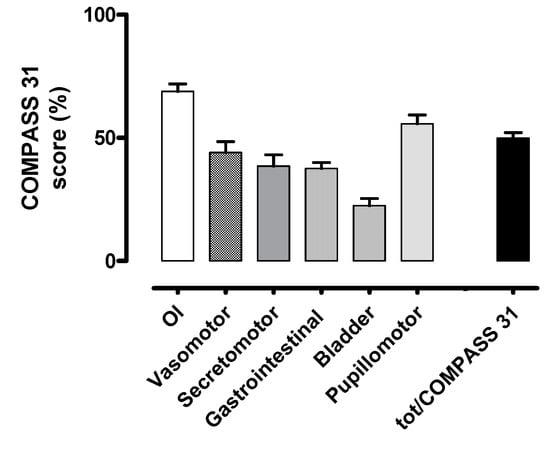 Baseline autonomic symptom assessment by COMPASS 31 questionnaire. OI indicates orthostatic intolerance domain; Vasomotor, vasomotor function domain; Secretomotor, secretomotor function domain; Gastrointestinal, gastrointestinal function domain; Bladder, bladder function domain; Pupillomotor, pupillomotor function domain; tot/COMPASS 31, total COMPASS 31 score. The scores are here represented as a percentage of the maximum value obtainable in each domain.