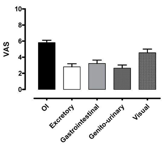 Autonomic symptom assessment at baseline by modified VAS. OI indicates orthostatic intolerance; Excretory, excretory function; Gastrointestinal, gastrointestinal function; Genito-urinary, genito-urinary function; Visual, visual acuity.