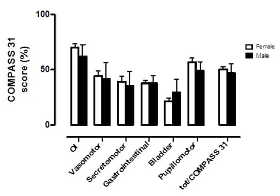Baseline autonomic symptom assessment by COMPASS 31 according to gender. OI indicates orthostatic intolerance domain; Vasomotor, vasomotor function domain; Secretomotor, secretomotor function domain; Gastrointestinal, gastrointestinal function domain; Bladder, bladder function domain; Pupillomotor, pupillomotor function domain; tot/COMPASS 31, total COMPASS 31 score. The scores are here represented as a percentage of the maximum value obtainable in each domain.