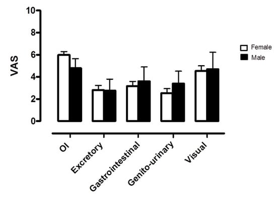 Autonomic symptom assessment at baseline by modified VAS according to gender. OI indicates orthostatic intolerance; Excretory, excretory function; Gastrointestinal, gastrointestinal function; Genito-urinary, genito-urinary function; Visual, visual acuity.