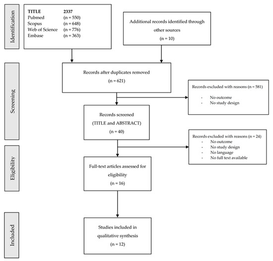 As shown in the flow diagram reported in Figure 1, a total of 2337 articles were retrieved. Of these, twelve studies [9,10,11,12,13,14,15,16,17,18,19,20] were finally included. All studies had a cross-sectional design. Three studies used instrumental measurements, conducting laboratory experiments on healthy volunteers [13,20] or in a real working setting [9], while the other studies were based on anamnestic surveys.