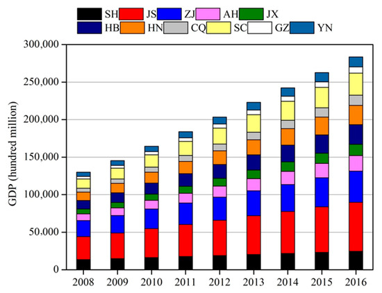 The economy increased in the YREZ from 2008 to 2016, with an average annual growth rate of 10.25%. Compared with the developed eastern region, the central and western regions had a weaker economic base, with a higher average annual growth rate (10.93%–13.22%) (Figure 2). From 2012, China has been undergoing a deep socio-economic transformation; the growth rate of the GDP was first observed to decrease since the reform and reopening in China [23]. This economic development phenomenon was termed the Chinese new normal. The average annual growth rate of GDP in the YREZ decreased from 11.84% during 2008–2012 to 8.67% during 2012–2016.