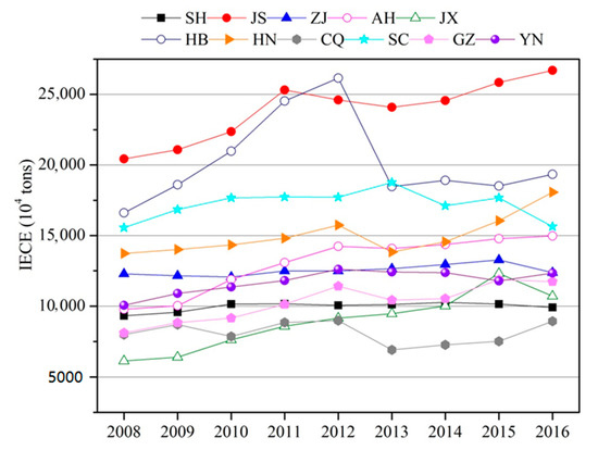 The total carbon emissions in the YREZ increased from 129,981.41 × 104 tons in 2008 to 160,728.26 × 104 tons in 2016, with an annual average growth rate of 2.79%. Due to the slow-down in China’s economic growth, CO2 emissions have remained relatively stable since 2012 [26]. The annual average increasing rate of IECEs in the YREZ was 5.86% during 2008–2012, while it decreased to −0.28% during 2012–2016.