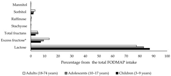 | FODMAP Intake | Children (3–9 Years) | Adolescents (10–17 Years) | Adults (18–74 Years) | Children vs. Adolescents | Children vs. Adults | Adolescents vs. Adults | |||