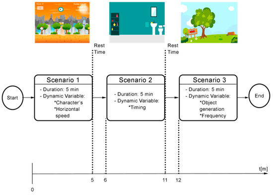 PetsGo is an exergame that aims at promoting PA in children aged 5 to 7 []. This game is made up of different scenarios. The main game interface is an alphanumeric floor mat acting as a keyboard called Hopscotch []. The scenarios at the beginning of the game include warm-up exercises, which are performed stepping on the floor mat. Other scenarios require upper and lower limb movements and stretching exercises. The three scenarios used in this study (excluding the warm-up exercises) are scenario 1, where a flying bird-like character is displayed with the objective of catching coins appearing on the screen while moving horizontally. Scenario 2 presents an interface with a bathtub. This scenario uses two-color blocks and a counter. The objective is to press the button before the counter reaches zero. Finally, scenario 3 displays a tree from which color blocks are generated. The objective is to touch the button before the color blocks hit the ground. These previously mentioned scenarios are illustrated in Figure 1. A detailed description of the scenarios in the context of the experimental design is presented in Section 2.2.7.