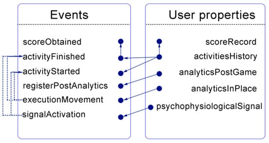 In software engineering, events are state alterations of constituent parts of the software system []. The user-exergame interaction requires to collect the necessary user properties. The events “activityStarted” and “scoreObtained” allow us to obtain the “activitiesHistory” and “scoreRecord” user properties (Figure 2). The event “activityStarted” triggers a flag when a scenario starts, whereas “scoreObtained” saves the score when this is over. For the latter, and to secure a correct score, the event “activityFinished” is responsible for establishing whether the scenario completed its normal execution or not. For the “analyticsPostGame” and “analyticsInPlace” user properties, the events “registerPostAnalytics” and “executionMovement” are activated, respectively. The first event registerPostAnalytics” notifies when questionnaire-based user experience is submitted to the system, while “executionMovement” identifies each point in time the AC evaluates the user experience. Finally, the event “signalActivation” indicates when to start collecting data for the “psychophysiologicalSignals” user property.