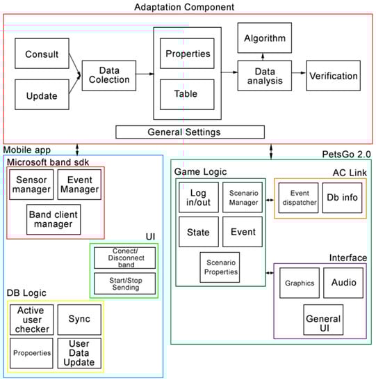 The AC development process rigorously followed the general adaptivity model (GAM) [], which is a methodology used to incorporate adaptive models into computer systems. We used PetsGo as the base software system to identify AC’s requirements and constraints. After implementing the AC, the adaptability of the component was evaluated with an experiment (described in detail in Section 2.5).
