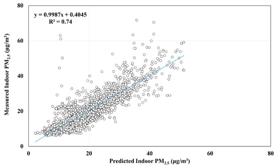 Relationship between predicted and measured hourly average indoor PM2.5 concentration according to the multiple linear regression model.