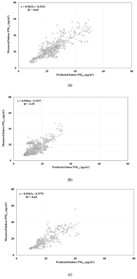 Studies have completed cross-validation for prediction models [13,15,50]. In this study, we also conducted cross-validation, which revealed that R2 > 75%. Figure 3 and Figure 4, respectively, illustrate significant correlations between predicted and measured indoor PM2.5 concentrations in different seasons and areas. These correlations were significant, and the R2 values ranged from moderately correlated to highly correlated, which indicates that the prediction model in this study can be used to estimate indoor PM2.5 concentrations in across seasons and areas in Taiwan. However, Figure 2, Figure 3 and Figure 4 show some measurements have larger relative errors, especially in winter. In Sun’ study [51], they found that window opening/closing behavior significantly affected the error on the prediction model of indoor PM2.5 concentration. Our study did not investigate the time point and frequency of window opening/closing behaviors. Thus, the time point or frequency of window opening/closing behaviors investigation was necessary in the near future for reducing the relative error.