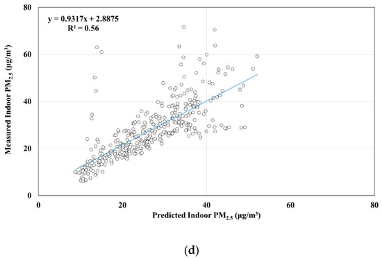 Relationship between predicted and measured hourly average indoor PM2.5 concentration across seasons: (a) spring, (b) summer, (c) fall, and (d) winter.