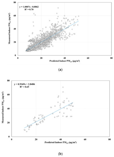 Relationship between predicted and measured hourly average indoor PM2.5 concentration across areas: (a) urban and (b) nonurban areas.
