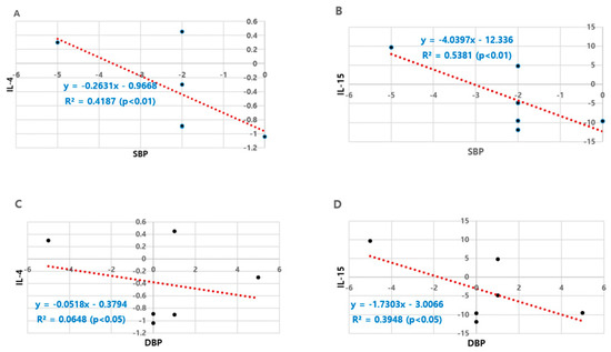 Analysis of major factors that showed significant pre–post differences in SBP and DBP identified the anti-inflammatory factors, IL-4 and IL-15, as factors with the highest correlation coefficients in Figure 1. In particular, the changed amount of IL-15 was significantly associated with those of SBP and DBP, yielding correlation coefficients of −0.734 and −0.628, respectively.