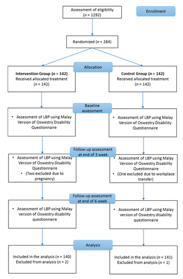 Participants were given the option to withdraw at any point in time. The withdrawal criteria included pregnancy during the intervention period, injury during the intervention program, worsening back pain, changes in place of work during the intervention, and withdrawal due to personal option.
