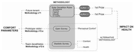 - Methodology no. 1: this is the one used by the Solar Decathlon competition organizers, and is based exclusively on measurable parameters: temperature, relative humidity, natural lighting and outside noise. It is an objective methodology, focused on satisfying the comfort of the future inhabitants of the prototypes presented in the competition. Under this methodology, the University of Seville won first prize in the 2015 (Cali, Colombia) and 2019 (Budapest, Hungary) editions of Solar Decathlon. However, this research defends that the comfort of the habitat should not be exclusively quantifiable and objective, but it is also fundamental to know what that living space transmits and how it makes the people who interact with it feel. Therefore, because methodology no. 1 is considered incomplete from the point of view of the analysis of comfort on the user’s health, the members of the University of Seville carried out two other alternative procedures that were tested in the Solar Decathlon 2015 (methodology no. 2-a) and 2019 (methodology no. 2-b).