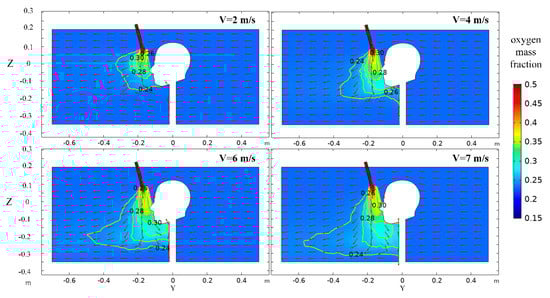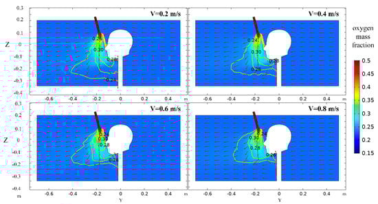 - Case 3, the angle of the oxygen-supply duct was 15 °C, and the nozzle outlet was aligned to the direction of the human nose. Due to the inertia effect, more oxygen was concentrated between the human nose and mouth, which improves the oxygen mass fraction of the air inhaled by human. Furthermore, the level of the nozzle outlet was 0.06 m lower than the top of the human head, which made the blocking effect of the human body on the airflow of the tunnel stronger, so the high concentration of oxygen emitted by the nozzle was less affected by the airflow in the tunnel, and the oxygen mass fraction of the air inhaled by human reached 26.4%.