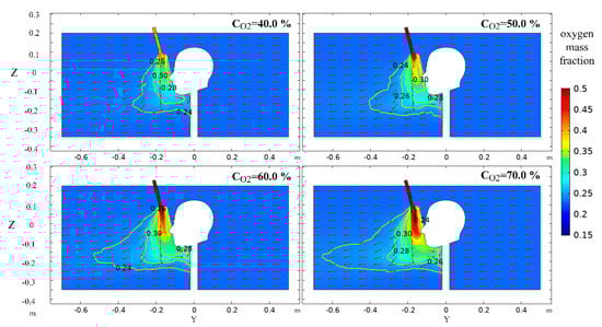 - Case 1: when the oxygen was ejected vertically downward through the nozzle, the area with high oxygen mass fraction was located in front of the human nose. Moreover, the diffusion of oxygen far away from the human nose increased with the interference of the airflow in the tunnel, and the oxygen mass fraction of the air inhaled by the body was 25.4%.