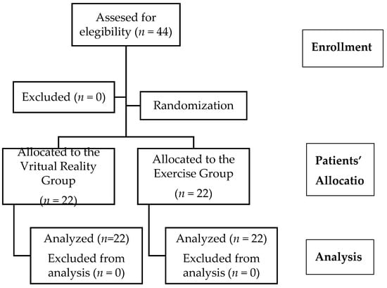 The randomization was performed using a computer-generated random sequence table with an unbalanced four-block design (GraphPad Software Inc., San Diego, CA, USA). One of the researchers that was not involved in the data collection or intervention of the subjects of the study generated and oversaw the randomization list. A number was randomly given to each of the subjects and with the software they were anonymously and randomly allocated in one of the two groups using the generated list, ensuring the blind allocation and including 22 participants in each group. Nonetheless, the subjects were conscious of whether or not they were wearing the VR headset therefore they knew if they belonged to the intervention or control group and could not be blinded. Qualified physiotherapists performed the assessments and interventions and a different researcher who was blinded to the allocation conducted the assessment of the outcomes.