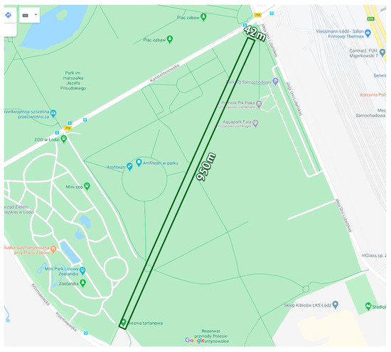 The athlete tapered his training (i.e., gradually reduced exercise over a short period of time and then stopped completely before the competition) two weeks before start of the 24-h UM. The run started at 12:00 AM on 8 April 2017. The competitors ran on a 1984 m asphalt loop in a clockwise fashion. The loop was a 950 m by 42 m rectangle (Figure 1 and Figure 2). Our study subject ran 129 loops and performed 516 rectangular turns. On one of the straight sections, there was a tent in which the athlete could stop for a meal, a short rest, and basic hygiene. After 12 h, he stopped for 12–15 min for a warm meal, a change of shoes, and other hygienic activities. In addition, he used the toilet three times (2–3 min each). He ate and ingested liquids along the run. The weather conditions are presented in Table 1.