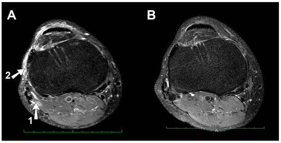 (A) Magnetic Resonance Imaging 2017 (axial scan), overload and post-traumatic lesions tangential to the distal biceps femoris short head and around the plate of the myotendinous junction (arrow 1), an edema, a small hemolyzed hematoma penetrating tangentially to the posterior medial edge of the fibula head and periarticular soft-tissue edema (arrow 2). (B) Re-examination in 2020. Overload effects from post-run examination are absent.