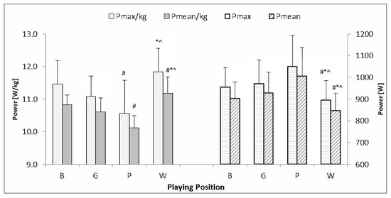Differences in absolute maximal power (Pmax) and mean power (Pmean) as well as relative maximal power (Pmax/kg) and mean power (Pmean/kg) in the RSA test for athletes of various playing positions. B—backs, G—goalkeepers, P—pivots, W—wings, #—significantly different from B, *—significantly different from G, ^—significantly different from P.
