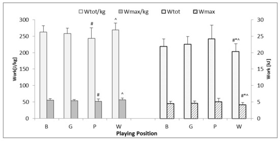 A similar relationship to that presented in Figure 1 can be found in Wmax and Wtot values. The W players had significantly lower absolute values of those variables than B, G, and P players (p < 0.05). However, the relative values of Wmax and Wtot were higher in the W and B groups than in P (p < 0.05) (Figure 2).