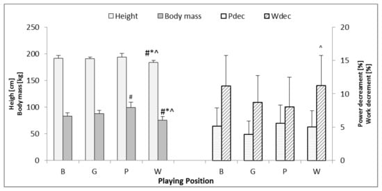 Differences in height, body mass, work decrement (Wdec), and power decrement (Pdec) in the RSA test for athletes of various playing positions. B—backs, G—goalkeepers, P—pivots, W—wings, #—significantly different from B, *—significantly different from G, ^—significantly different from P.