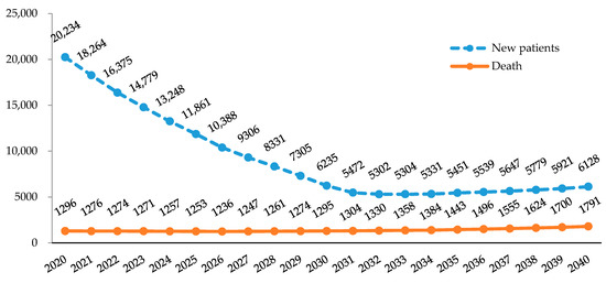 Projected number of new cases of tuberculosis and deaths caused by tuberculosis in Korea, 2020–2040.