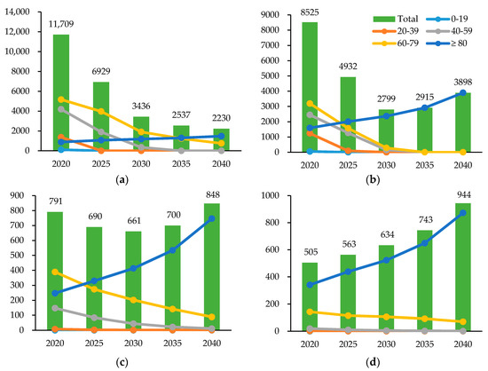 When estimated age- and sex-specifically, new cases of TB are expected to show a descending trend in total among the male population. In the female population, projected TB cases decrease from 8525 in 2020 to 2799 in 2030 and increase again to 3898 in 2040, due to the large growth rate in those aged 80 years and older (Figure 3a,b). The number of deaths due to TB shows a descending trend in all age groups below 80, while the age group 80 years or above showed a continuously increasing trend in both sexes (Figure 3c,d).