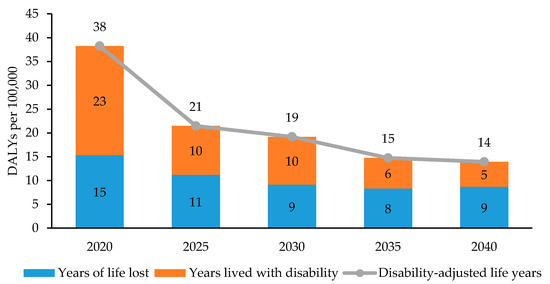 We used time-series modeling to estimate the DALYs. We modeled the incidence rates using an exponential smoothing state space model with trigonometric regressors to model multiple seasonalities, Box–Cox transformation, autoregressive moving average (ARMA) errors, trend, and seasonal components (TBATS model) [23]. The model and its compositional parameters are shown in Appendix C. TBATS uses a combination of Fourier terms with an exponential smoothing state space model and a Box–Cox transformation to evaluate multiple forecasting techniques. In the model, the ARMA filter had components of p = 0 and q = 0, while the seasonal periods were m1 = 1. The model with the lowest Akaike information criterion score was selected as optimal. We performed the sensitivity analysis by applying the moving block bootstrap technique suggested by Künsch [24] and Liu and Singh [25], through which the regeneration of auto-correlated time-series data is possible, to duplicate our results. The result from the moving block bootstrap simulation was adopted at the value 1. Time-series models were applied by using the forecast package in R Version 8.10, which uses R statistical software Version 3.6.1 (R Foundation for Statistical Computing, Vienna, Austria).