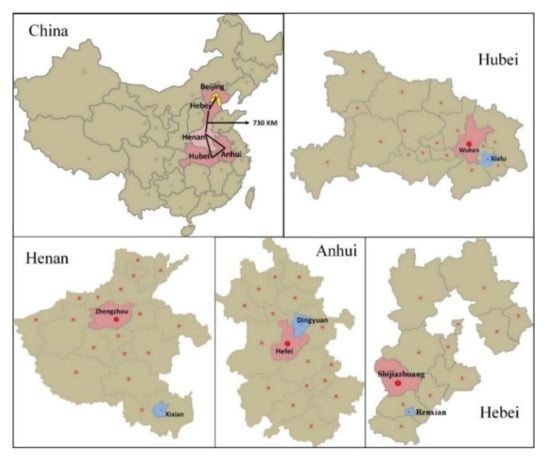 We conducted a cross-sectional survey from August to September in 2017 and adopted a multistage cluster random sampling method. First, we sampled from four provinces that are all located in the central plains of China and whose economic level is intermediate compared with that of other counties and cities in the country. We then selected counties with the third economic level in each province. The four counties selected, namely, Dingyuan, Xixian, Xialu and Renxian (Figure 1), are all close to the capital of the province or neighboring province, and the provincial hospitals can be reached in less than 2 h. Finally, we sampled in each county according to 0.4‰ of the population of each county; hence, we randomly selected two townships in four counties and then 3–4 villages in each township.